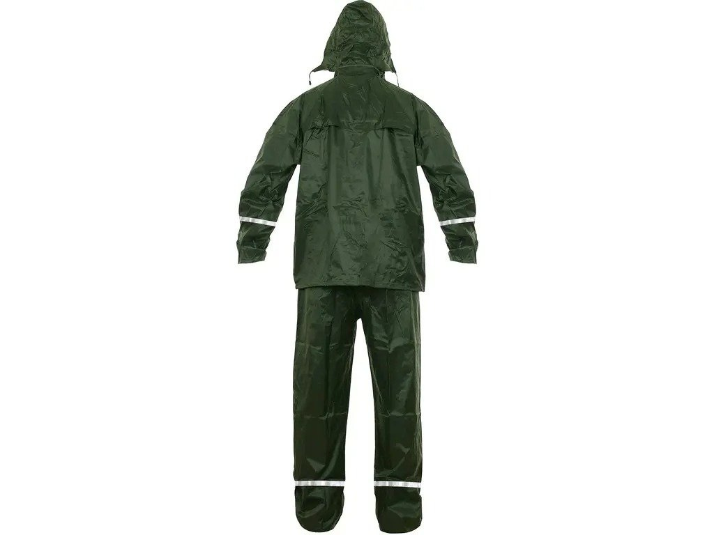 Popis: Nepromokavý oděv do deště s kapucí v límci, nižší hmotnost. Zapínání na zip, stahování v dolním okraji, větrání na zádech a v podpaží, kalhoty v pase do gumy, lepené švy. Praktické balení na zip